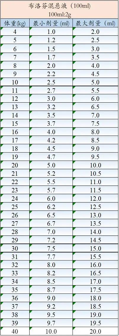 美林的正确给药剂量可参照表1中用法用量,根据孩子的体重,计算出美林的需要量。也可以按照孩子的体重对照表2、表3对应查找对应的服用剂量范围,根据孩子的发烧和继往用药情况,适当调整药物用量。