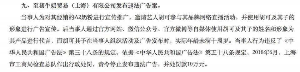 根据上述通告,至初牛奶贸易(上海)有限公司发布违法广告,当事人为对其经销的A2奶粉进行宣传推广,邀请艺人胡可参与其品牌网络直播活动,并使用胡可及其子的形象进行广告宣传。后当事人通过官方网站、微信公众号、官方微博等自媒体使用胡可及其子的姓名和形象为其产品进行代言,而胡可其子在当事人组织活动及广告发布时,实际年龄未满十周岁。