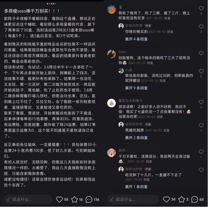这类产品确实能在短期内让体重数字唰唰往下掉,但它也存在一定风险,因为每个人的体质不同,有些人吃完后会出现严重不适。