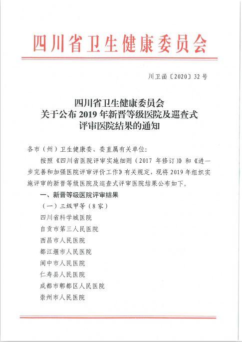 2月23日,四川省卫生健康委员会公布2019年新晋等级医院及巡查式评审医院结果,全省首批8家区县级医院获批三级甲等综合医院。其中,都江堰市人民医院成功跻身国家三级甲等综合医院行列。